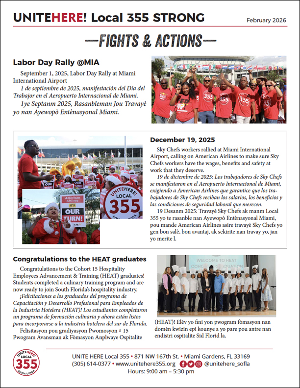 UNITE HERE Local 355 represents nearly 7,000 workers in South Florida extending as far north as West Palm Beach, as far south as Homestead and as far west as Fort Myers and we work in conjunction with our over 26,000 members in Orlando. UNITE HERE represents workers in airports, hotels, casinos, stadium and arenas. We are the hospitality union. We are the housekeepers, maintenance workers, bartenders, casino cashiers, airport cashiers, bellmen, dishwashers, banquet servers, cocktail servers, doormen, food runners, housemen, cooks, and slot attendants in some of the most prominent companies in South Florida like the Fountainebleau Hotel Miami Beach Resort, the Miami International Airport and Fort Lauderdale Hollywood International Airport. Members of Local 355 make the South Florida hospitality industry successful.